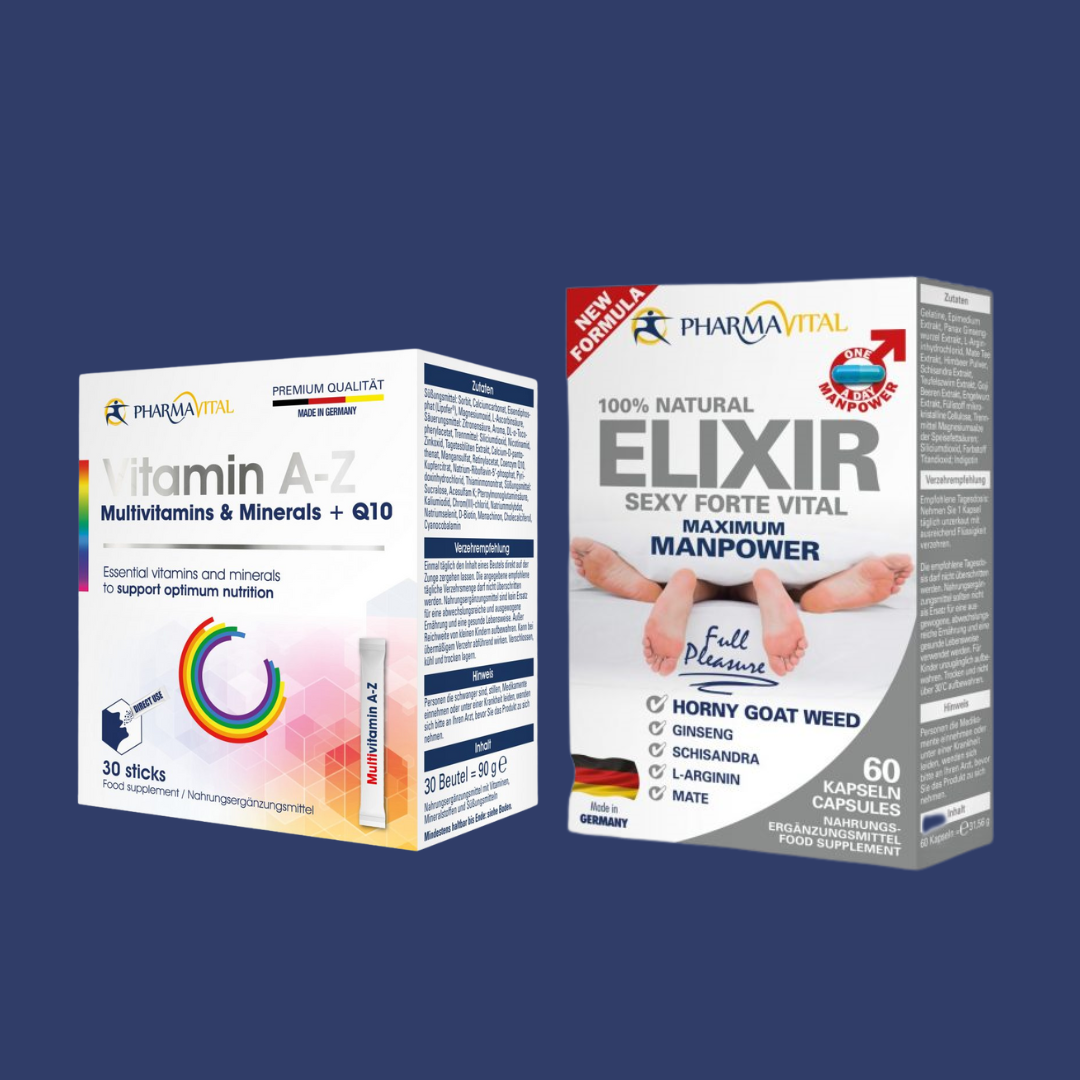Unleash performance that lasts. The Stefmeister Bundle brings together two powerhouse formulas — the Pharmavital A-Z sticks and the Pharmavital Elixir capsules — to support men’s vitality, stamina and mental clarity.